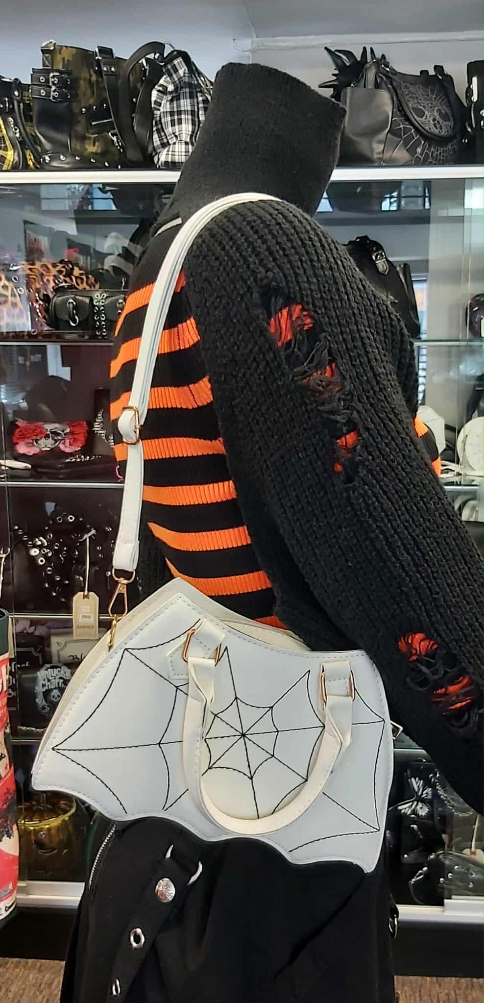 Small white batwing shaped purse with web stitching. Has a detachable, adjustable shoulder strap as well as a handle.