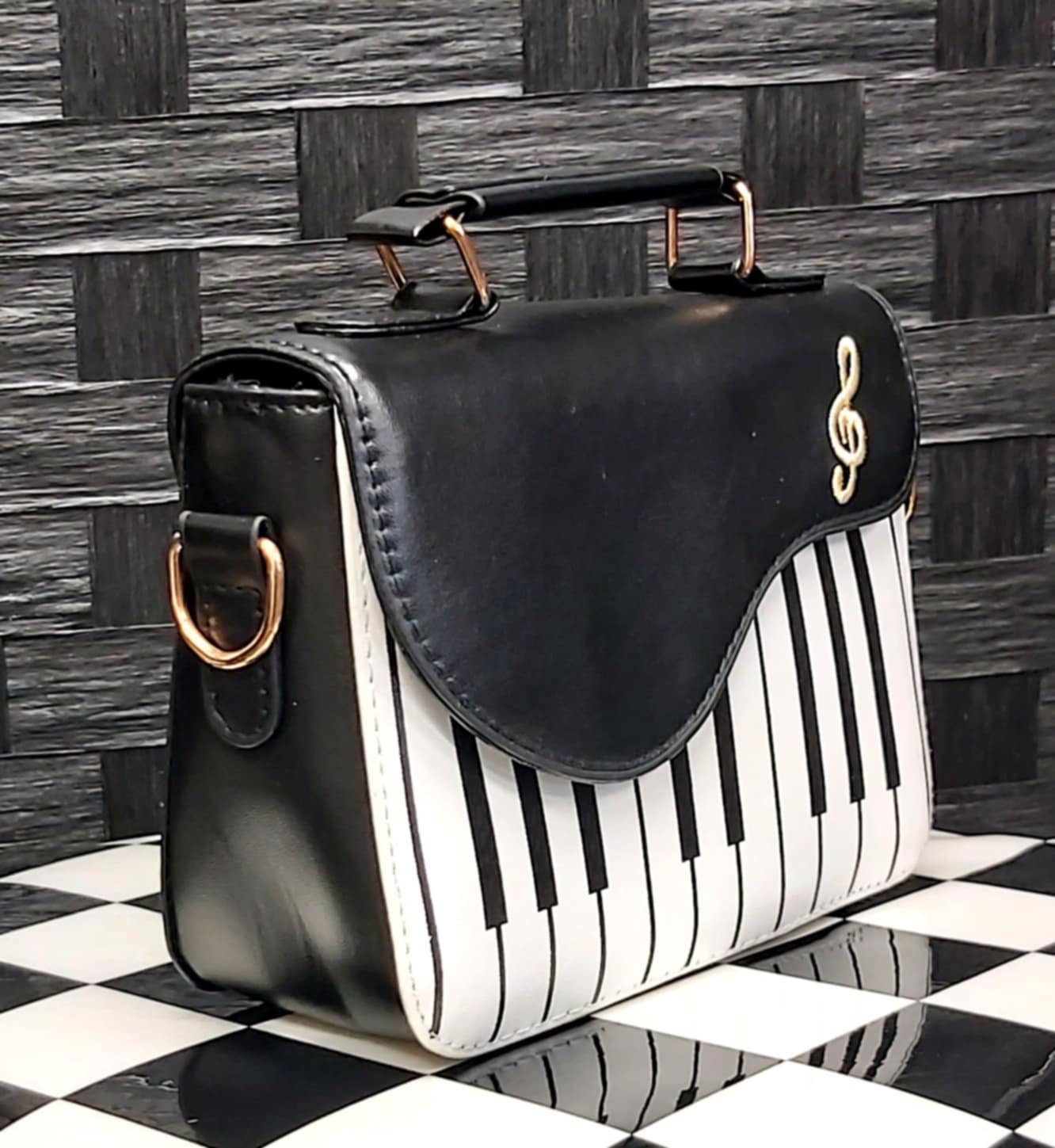 8 x 6 x 2.5in handbag with piano keys printed on thee front. Has a hard handle and a detachable adjustable shoulder strap. Can be worn as a crossbody,