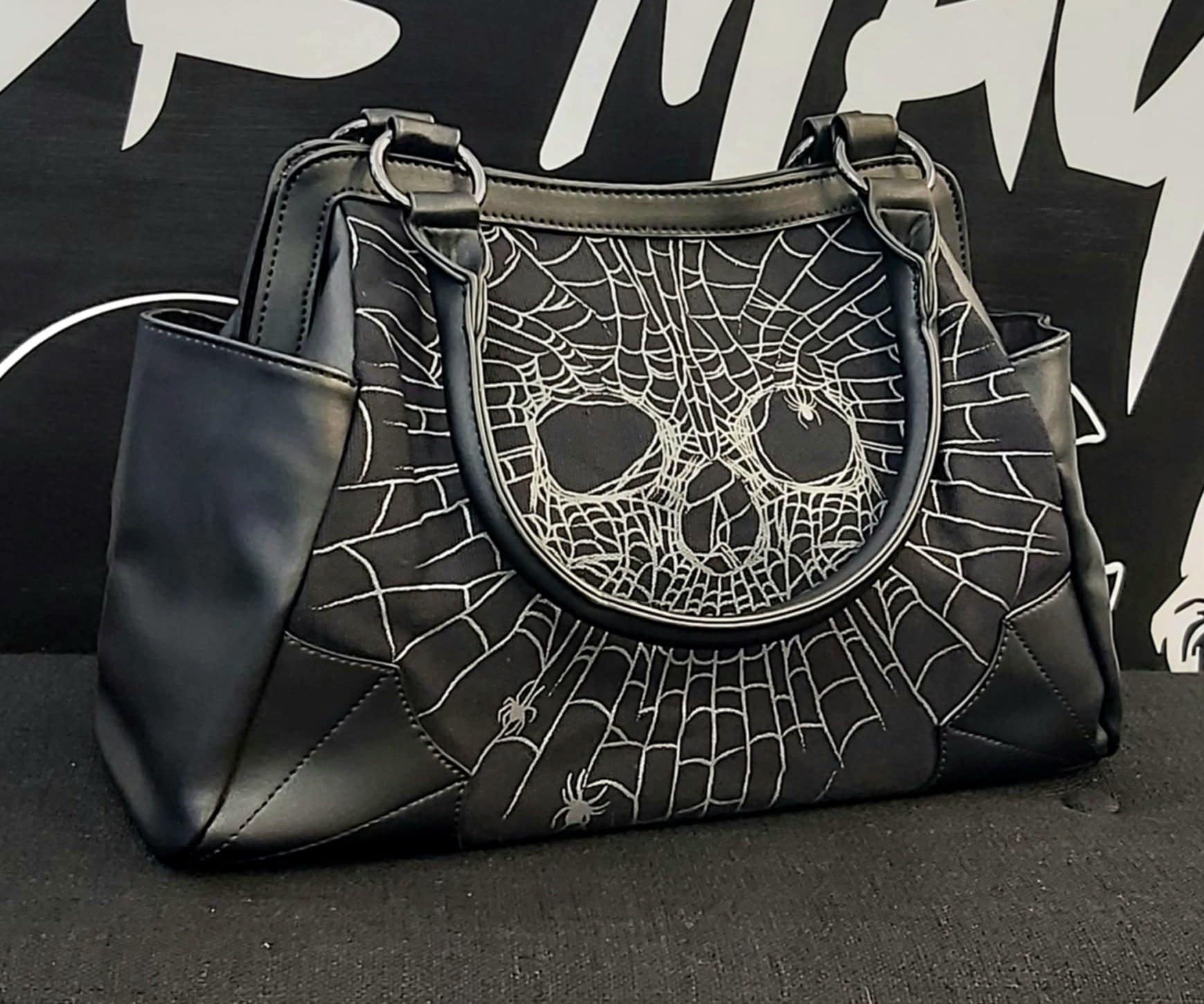 This handbag has attached handles, pockets on each end and a zipper and magnetic snap closure. It has a skull and spiderweb graphic printed on the front and a zip pocket on the back